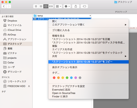 1. まず、Finderで対象となるファイルのあるフォルダを開いてファイルを選択し、「右クリック」若しくは「control + 左クリック」でコンテキストメニューを表示させ、コピーを選びます。ショートカットキーの「command + C」でコピーしてもOKです。