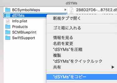 xcarchiveファイルを右クリックして、「パッケージの内容を表示」を選び、表示されたdSYMsディレクトリをそのまま、クラッシュログを置いたディレクトリへコピーしましよう。